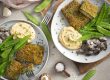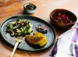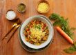 - Verdeel de bloemkoolrijst met groenten over 2 borden, voeg de tofu a la minute toe en de kerriesaus.